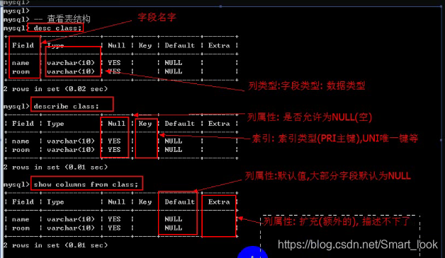 - des/descibe show columns from class --查看表结构:查看表中字段信息