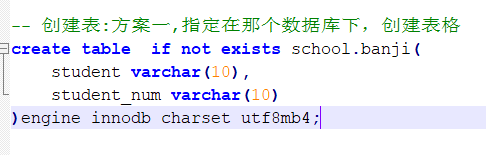 - 例子:方案一,指定文件在那个数据库下,创建表格