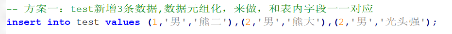 - 方案一:【最偷懒】给全表字段插入数据,不需要指定字段列表:要求数据的值出现的顺序必须与表中设计的字段出现的顺序一致:凡是非数值数据,都需要使用引号(建议是单引号)包裹