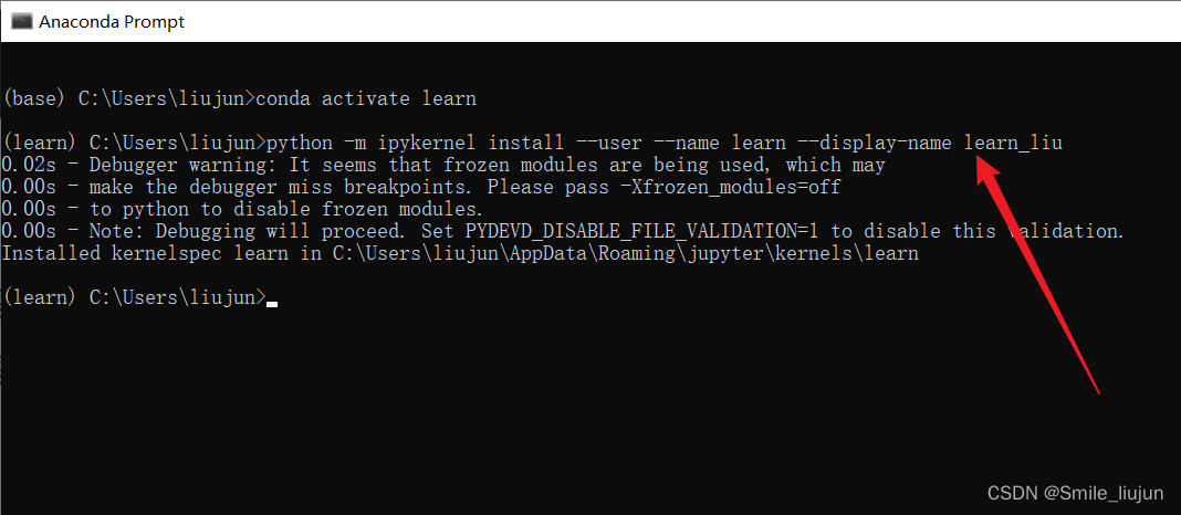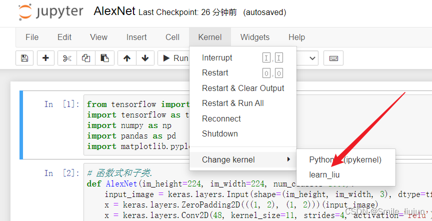- 其中“learn”为你所创建的虚拟环境名称,“learn_liu”为 jupyter显示的名称。