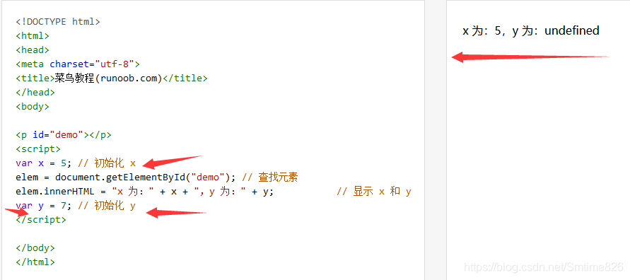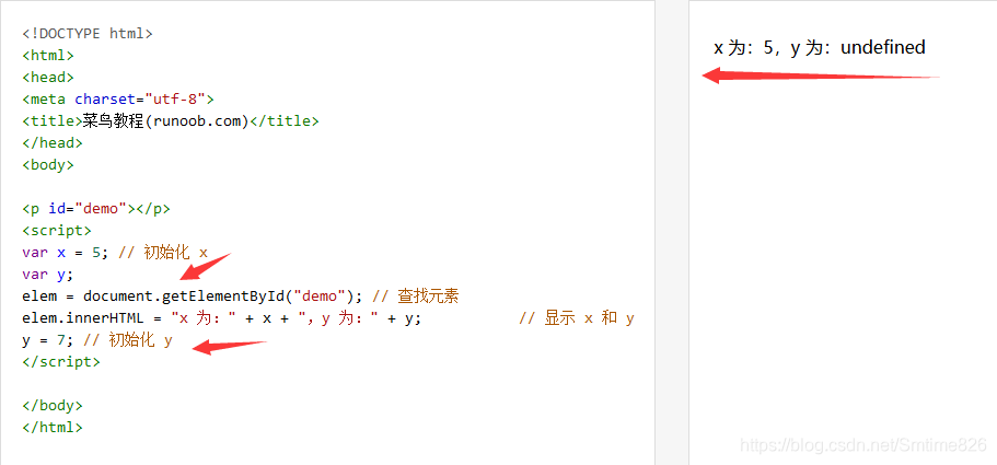 y 输出了 undefined,这是因为变量声明 (var y) 提升了,但是初始化(y = 7) 并不会提升,所以 y 变量是一个未定义的变量。