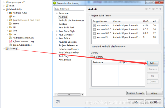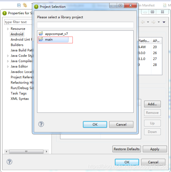 右键属性在Library添加上面main工程,顺便也把工程使用最新的sdk