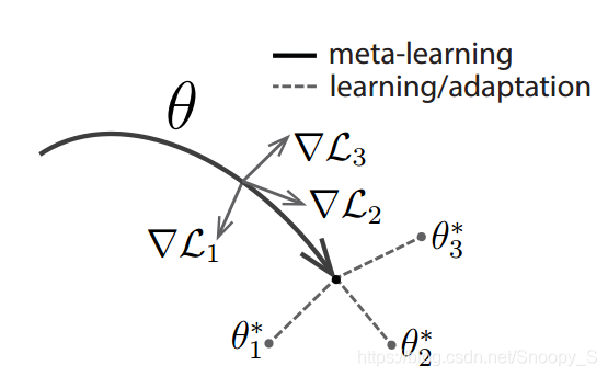 如图所示,实线代表元学习器,三个虚线代表三个不同的任务,一般情况下需要三个学习器来分别训练完成,而元学习器的作用就是通过来自任务的少量数据学习并更新学习器的参数,使得这一个模型经过参数的改变后能够解决三个问题。