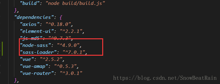 npm install --save-dev node-sass npm install --save-dev sass-loader在这里需要的注意的node-sass经常安装会出错,可以用cnpm,或者多安装几次。成功之后打开package.json文件,会有这两个信息
