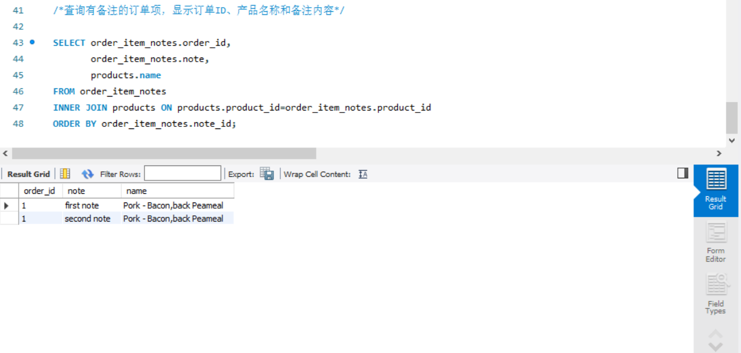 查询有备注的订单项,显示订单ID、产品名称和备注内容