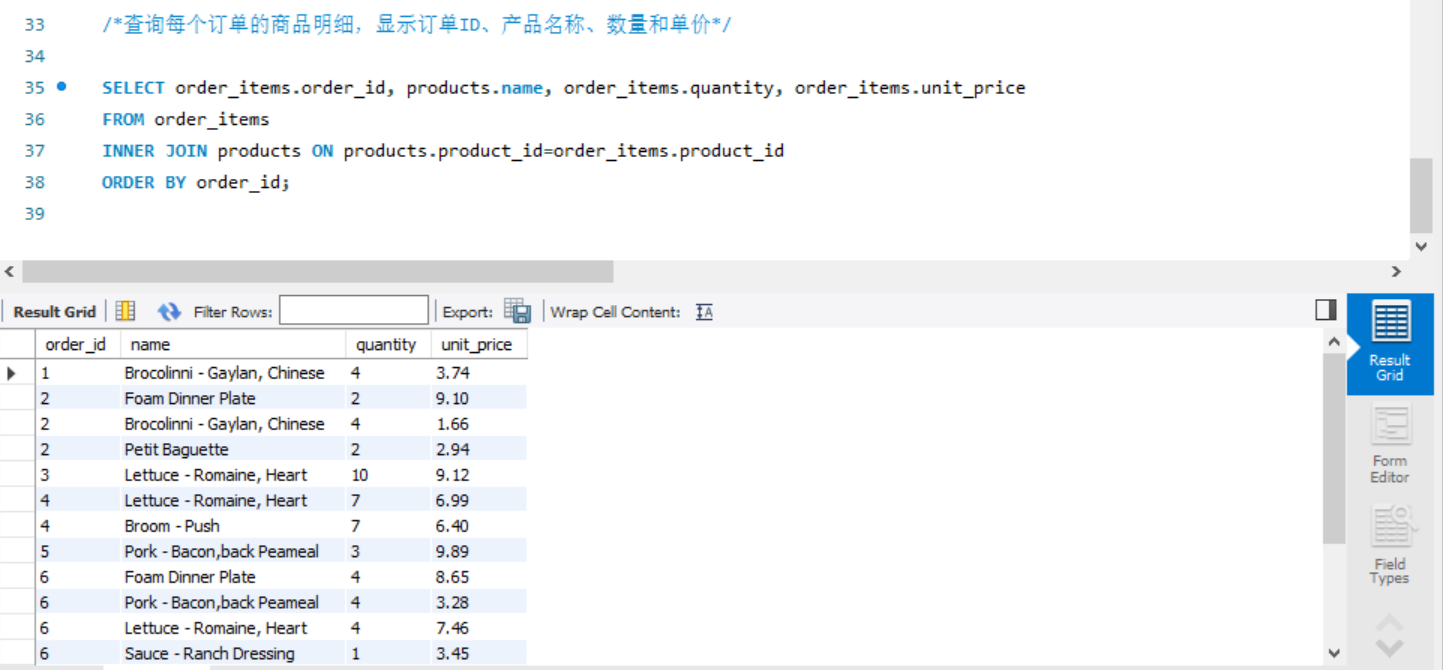 查询每个订单的商品明细,显示订单ID、产品名称、数量和单价