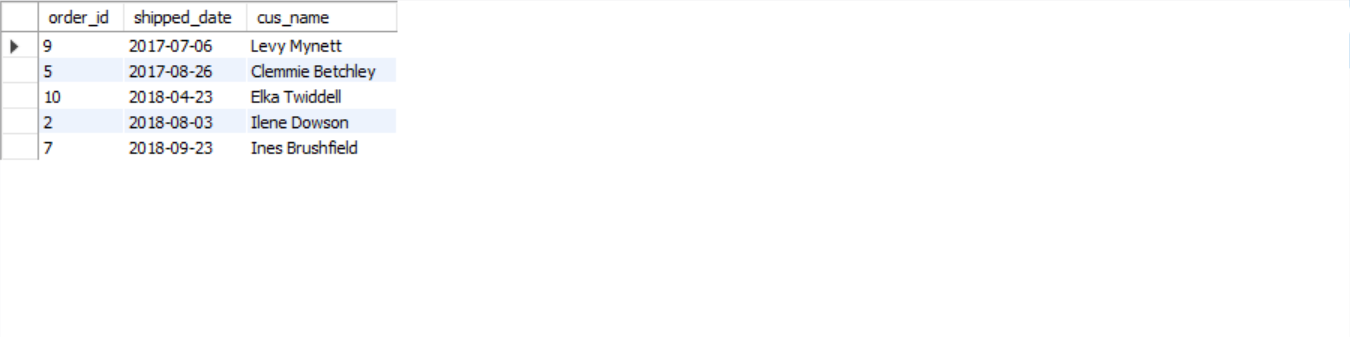 SELECT orders.order_id, orders.shipped_date, CONCAT(customers.first_name, ' ', customers.last_name) AS cus_name