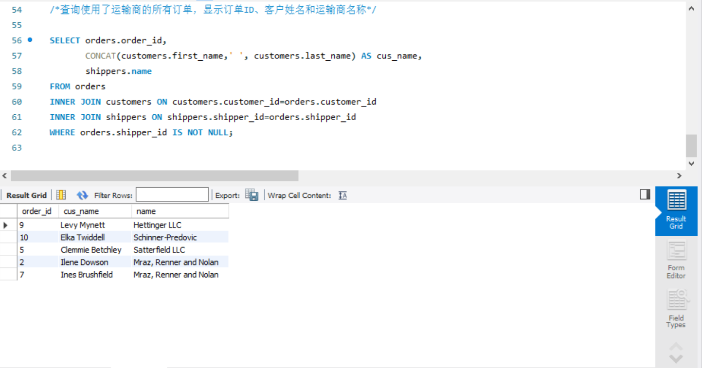 查询使用了运输商的所有订单,显示订单ID、客户姓名和运输商名称