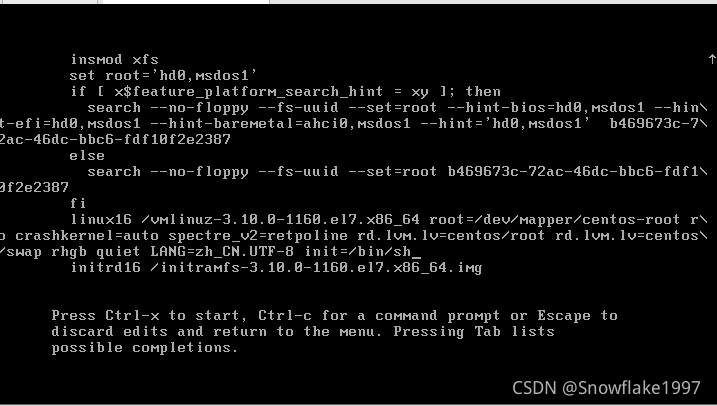 4.当重启后出现下面的页面时,按下E会出现下面页面,而后在linux16这段的最后输入init=/bin/sh。
