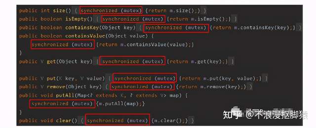 第二种方法是返回一个SynchronizedMap对象,这个对象默认每个方法会锁住整个对象。如下源码: