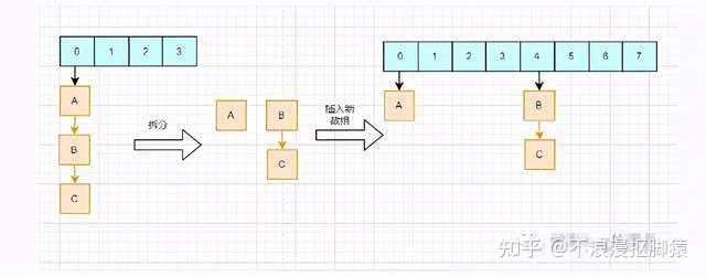 从图中我们可以看到,在新数组中的hash结果,仅仅取决于高一位的数值。如果高一位是0,那么计算结果就是在原位置,而如果是1,则加上原数组的长度即可。这样我们只需要判断一个节点的高一位是1 or 0就可以得到它在新数组的位置,而不需要重复hash计算。HashMap把每个链表拆分成两个链表,对应原位置或原位置+原数组长度,再分别插入到新的数组中,保留原来的节点顺序,如下: