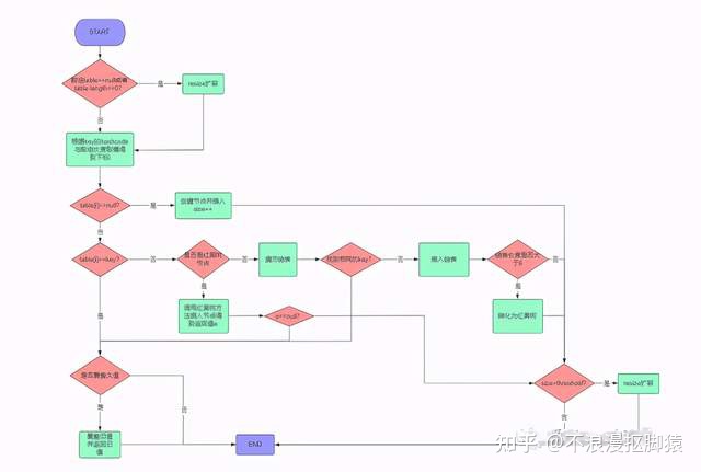 - 总体上分为两种情况:找不到相同的key和找不到相同的key。找了需要判断是否更新并返回旧value,没找到需要插入新的Node、更新节点数并判断是否需要扩容。