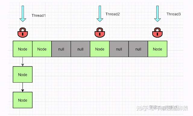 ConcurrentHashMap的设计就是为了解决此问题。他通过降低锁粒度+CAS的方式来提高效率。简单来说,ConcurrentHashMap锁的并不是整个对象,而是一个数组的一个节点,那么其他线程访问数组其他节点是不会互相影响,极大提高了并发效率;同时ConcurrentHashMap的操作并不需要获取锁,如下图: