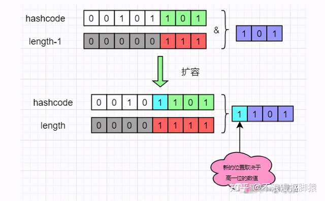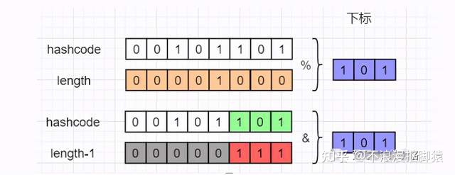 对hashcode扰动之后需要对结果进行取模。HashMap在jdk1.8并不是简单使用%进行取模,而是采用了另外一种更加高性能的方法。HashMap控制数组长度为2的整数次幂,好处是对hashcode进行求余运算和让hashcode与数组长度-1进行位与运算是相同的效果。如下图: