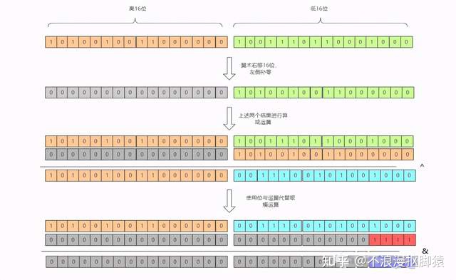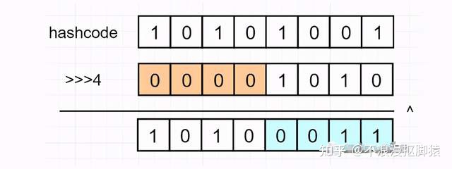 也就是低16位是和高16位进行异或,高16位保持不变。一般的数组长度都会比较短,取模运算中只有低位参与散列;高位与低位进行异或,让高位也得以参与散列运算,使得散列更加均匀。具体运算如下图(图中为了方便采用8位进行演示,32位同理):