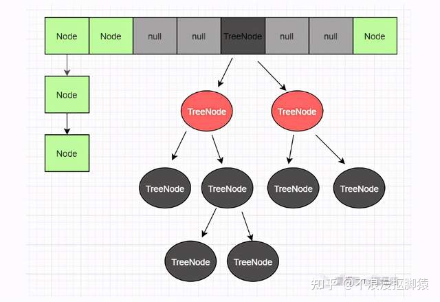 - 链表到达一定长度后需要扩展为红黑树,当且仅当链表长度>=8且数组长度>=64。