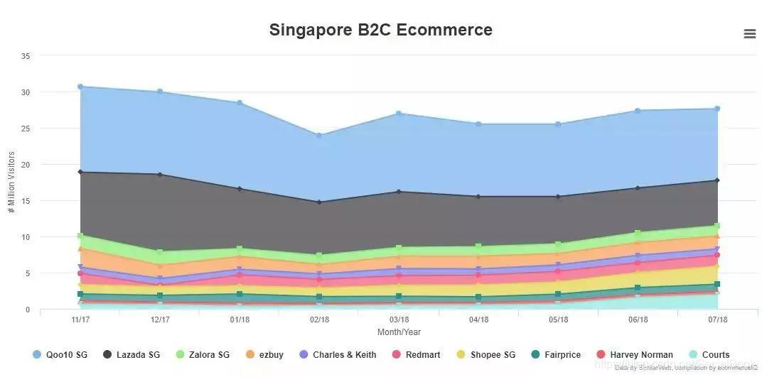 目前,新加坡排名前五的电商平台为:Qoo10 SG 、Lazada SG、Zalora SG、ezbuy、Charles & Keith。
