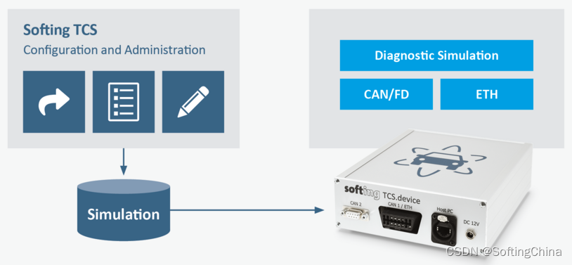 然而,如何建立一个可靠的仿真无疑是一大挑战。因为它必须支持一切所需的诊断协议;必须能够提供不同ECU全部诊断功能;必须能够轻松转换不同型号的车辆——无论是支持型号还是软件版本。对此,Softing推出的TCS能够很好地应对这一挑战。Softing TCS不仅支持CAN、CAN FD和以太网总线系统,而且支持将UDS、OBD、KWP2000OnCAN作为诊断协议,未来还将支持SAE J1939诊断协议,且其物理连接可通过OBD插头或CAN环境中典型的D-SUB连接器来进行。在不同的TCS使用场景中,只需配置加载到设备中的仿真模拟文件就可实现仿真模拟。