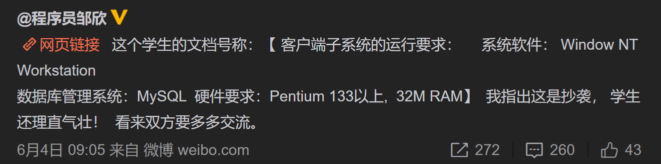 一模一样的句子和上下文至少 2008 年就有人写了, 2016年还是出现在很多同学的博客中。 所有写这写文字的同学, 都可以联合起来, 一起创业, 多爽, 大家都想到一块去了! 创业的公司名字可以叫 “抄袭大全”。 软件项目开发的各种文档, 也有人不假思索地照搬,十几年前的软硬件配置,也出现在2018年的文档中。 要求有 Windows NT, Pentium 133以上。 同学! 你们写的软件能跑在 Windows NT 上么?