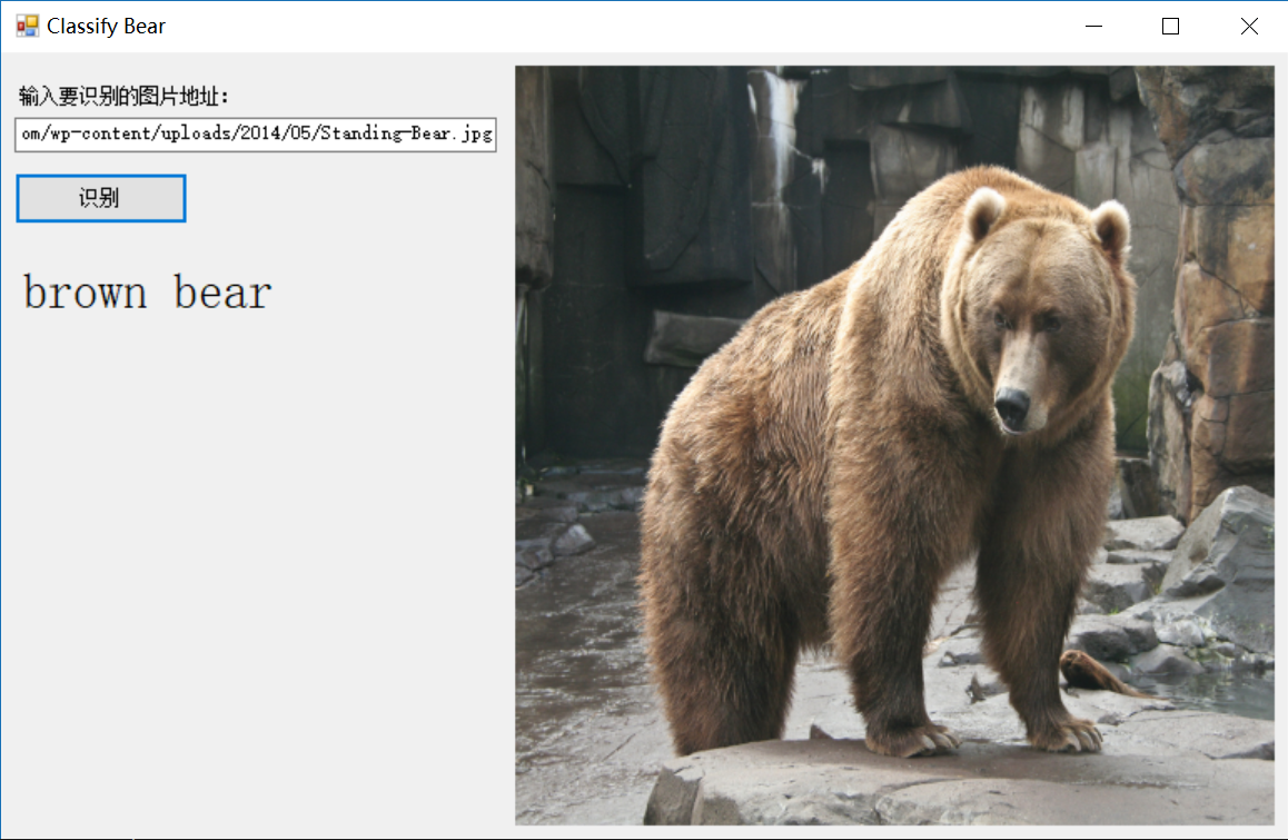 编译运行,然后在网上找一张熊的链接填到输入框内,然后点击识别按钮,就可以看到识别的结果了。注意,这个URL应该是图片的URL,而不是包含该图片的网页的URL。