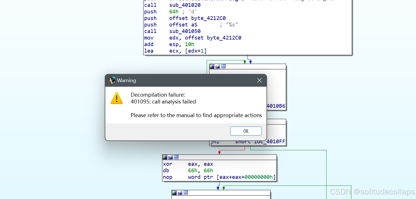 发现无法反汇编,由于我的汇编没有那么强,我选择不去直接看汇编代码,而是选择解决报错
