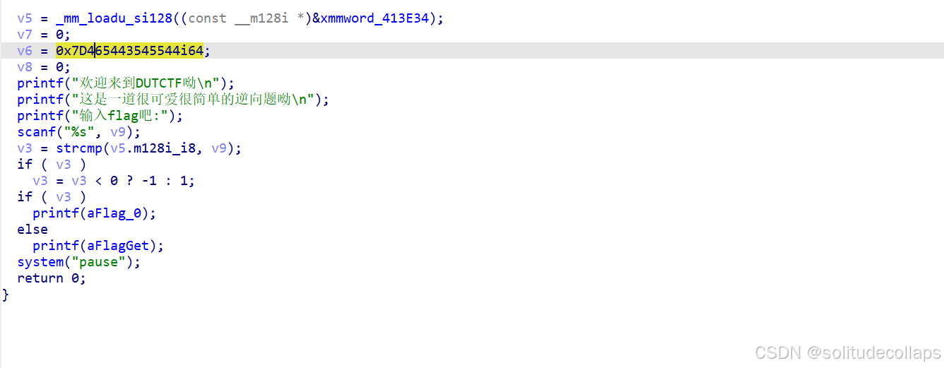这行代码的主要用途是从内存地址 xmmword_413E34 开始的位置加载128位整数向量数据,并将其存储到变量 v5 中。这样,v5 就可以用于后续的SIMD操作。
