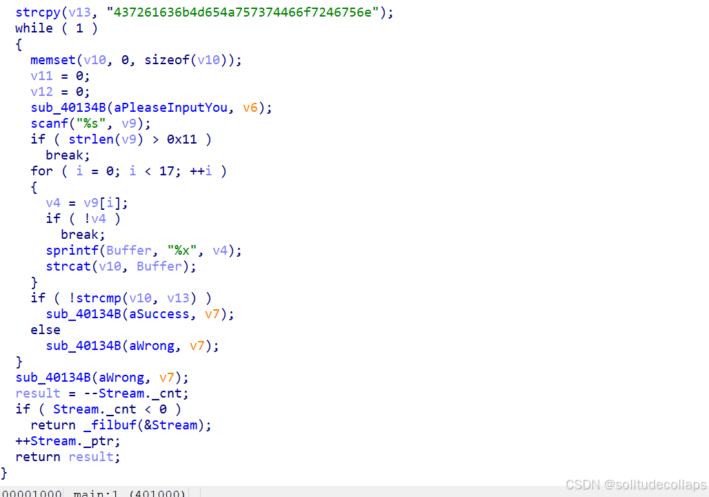 64位,elf文件,拖入ida,找到main函数,看伪代码