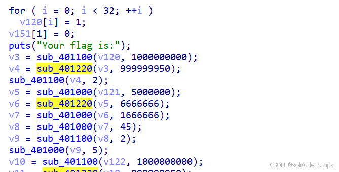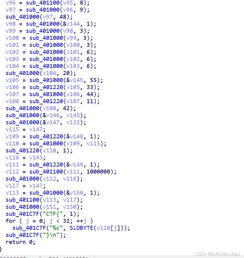 固定操作:查壳,拖入ida,看主函数,发现调用了一堆函数,所以先看主函数的末尾