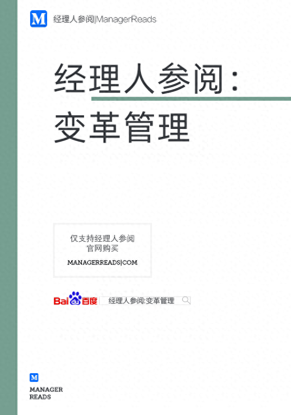首先,领导人要真正掌握组织变革管理的要义和基本知识,笔者强烈推荐你去看下《经理人参阅:变革管理》这本书。该书不仅能帮助你顺利完成变革,还能为未来的挑战打下基础。变革本身就是一种不断进化的过程,而管理者在这一过程中扮演的角色,既是指挥官,也是推动者,更是组织中的定海神针。