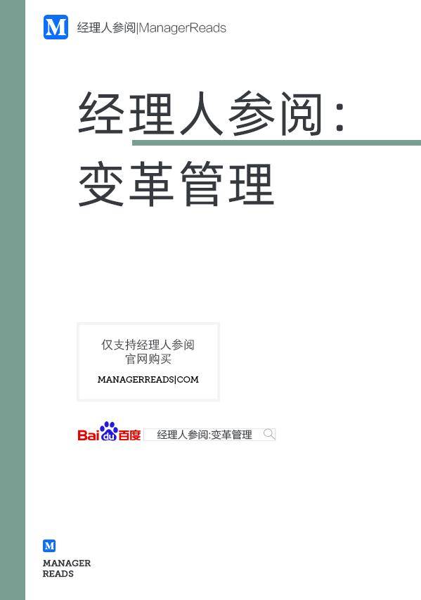 组织变革不单凭经验、不只靠经历,而是一个有规律可循、有步骤可走、有误区可避的科学框架。而这本《经理人参阅:变革管理》正是教你如何掌握这个框架,如此这般你才能获得组织持续成功的钥匙,让领导者从容应对变革和企业文化建设中的所有不确定性。