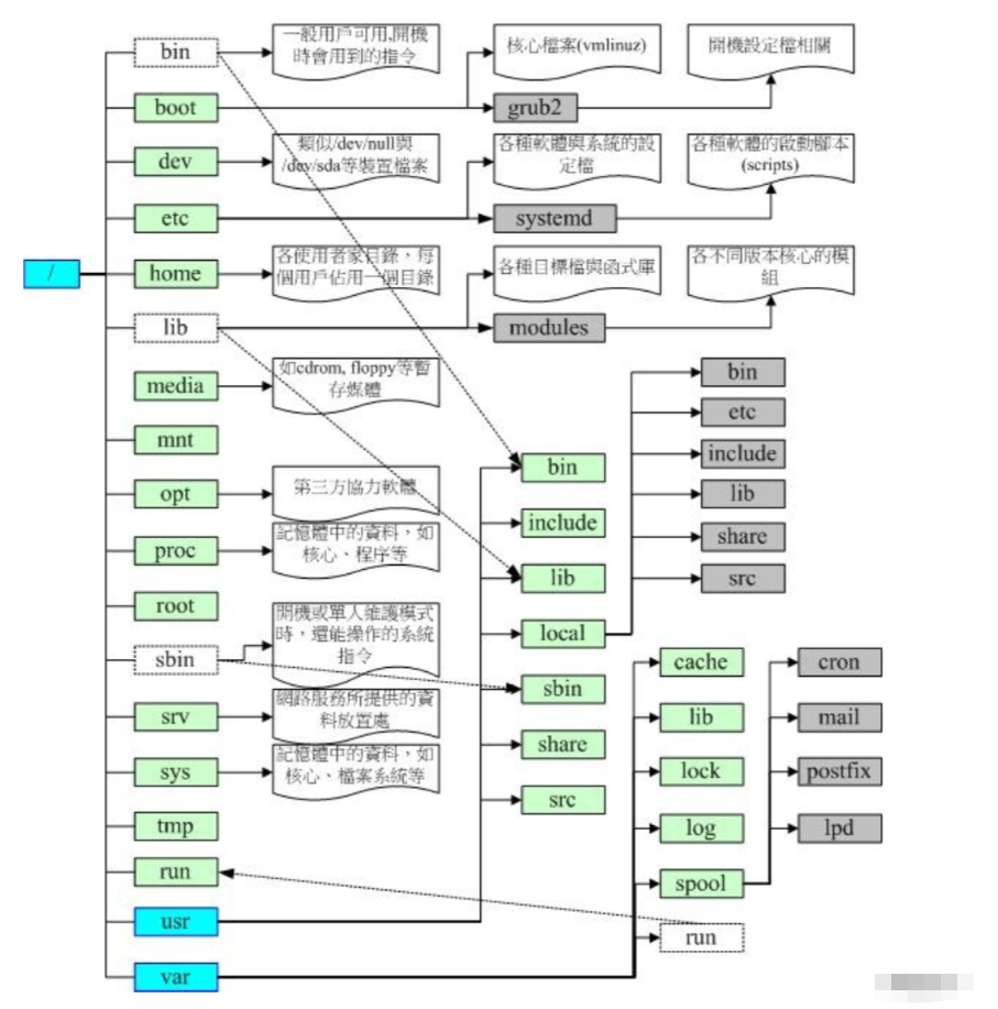 /:根目录,linux文件系统的最顶端和入口bin:存放用户二进制文件(如:ls,cd,mv等),实则/user/bin的硬链接(相当于Windows系统的快捷方式)boot:启动linux时使用的核心文件,存放内核引导配置文件dev:存放设备文件etc:存放系统配置文件home:用户主目录lib:动态共享库,作用类似于Windows里的DLL文件,实则/user/lib的硬链接lost+found:文件系统恢复时的恢复文件media:可卸载存储介质挂载点,例如U盘、光驱、移动硬盘等,linux会把识别的设备挂载到这个目录下mnt:文件系统临时挂载点opt:额外安装软件所摆放的目录proc:系统内存的映射目录,提供内核与进程信息root:root用户主目录run:临时文件系统,存储系统启动以来的信息,当系统重启时,这个目录下的文件应该被删掉或清除。如果你的系统上有/var/run目录,应该让它指向/runsbin:存放系统二进制文件,超级用户root可执行命令,实则/user/sbin的硬链接srv:存放服务相关数据sys:sys虚拟文件系统挂载点tmp:存放临时文件usr:存放用户应用程序var:存放邮件、系统日志等变化文件
