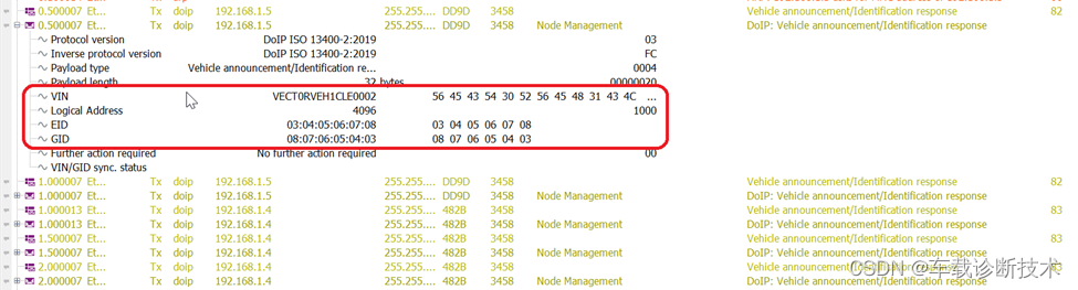 对于新加入到当前网络的车辆,在ISO 13400协议中有定义需要连续发送三次车辆声明(Vehicle Announcement),这三次车辆声明的信息如下: