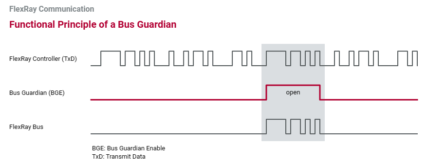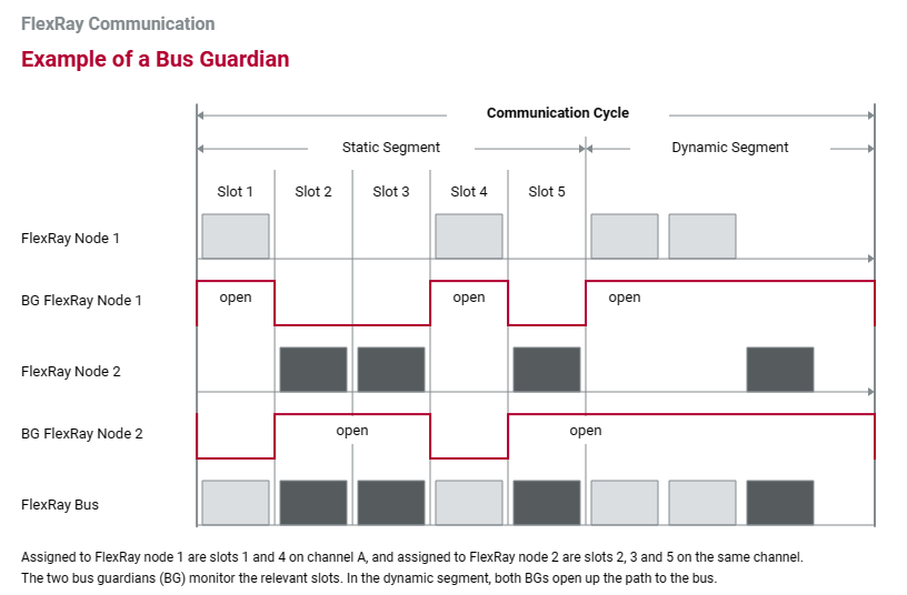 FlexRay主要用于安全和时间要求严格的汽车应用。在FlexRay簇中使用静态通信周期,并将时隙分配给FlexRay节点,可实现平稳的确定性通信流。然而,有故障的FlexRay节点可能会在未分配给它们的时隙内进行未经授权的传输,从而破坏这种确定性通信。总线监控器则可以防止这种情况发生。