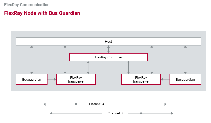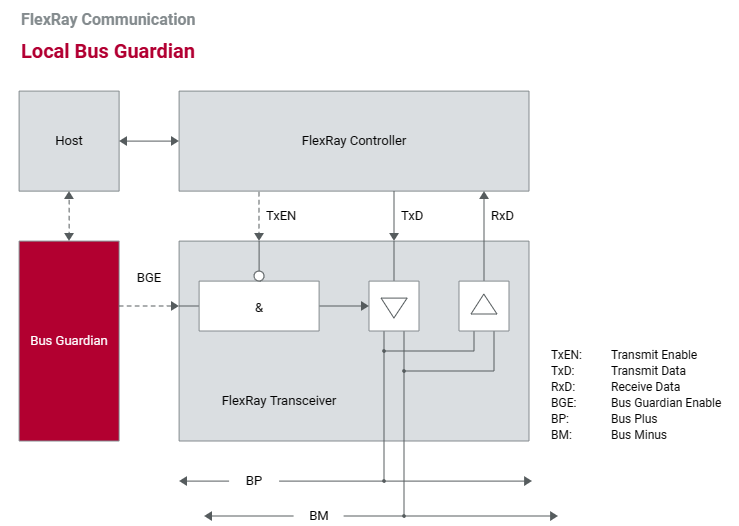 每一个FlexRay收发器都会配备一个总线监控器。只有在符合通信调度表的情况下,总线监控器才会允许FlexRay收发器将从FlexRay控制器接收的数据发送到总线上。
