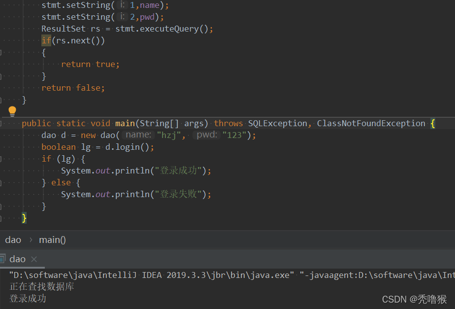dao类简述:name是用户名,pwd是密码,login()来访问数据库,成功返回true