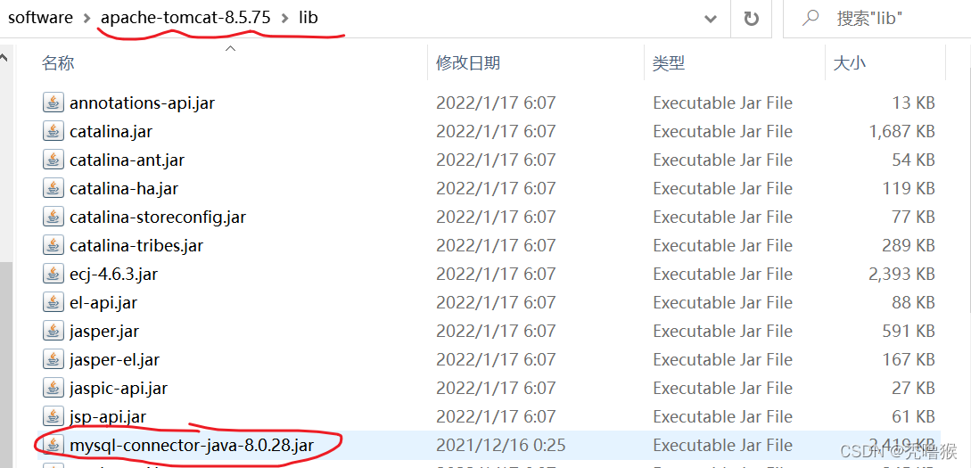 问题原因:Tomcat 的 lib 目录下没有驱动的 jar 包
