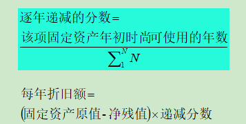 是将固定资产的原值减去净残值后的净额乘以一个逐年递减的分数计算每年折旧额的一种方法 |
