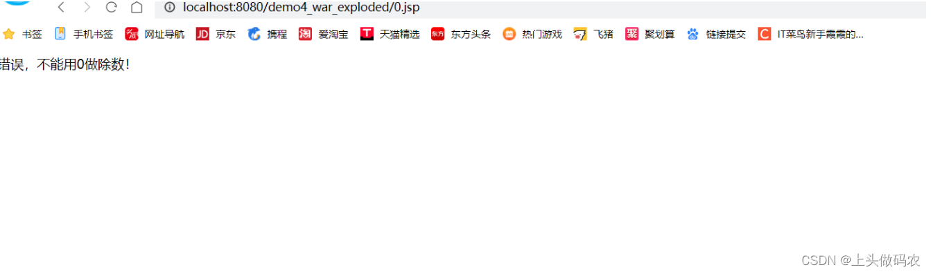该案例展示了一个JSP程序,利用Page指令设置了错误处理页面。在0.jsp中,尝试执行8除以0的操作导致异常,此时程序会跳转到error.jsp。error.jsp作为错误页面,显示不能用0做除数的错误信息,并打印出具体的异常消息。