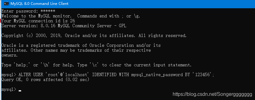 输入ALTER USER 'root'@'localhost' IDENTIFIED WITH mysql_native_password BY '**********';
