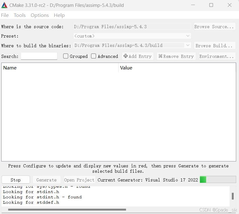 3.再重新在cmake中configure,若无报错,仅有warning不管它,接着generate,最后open files