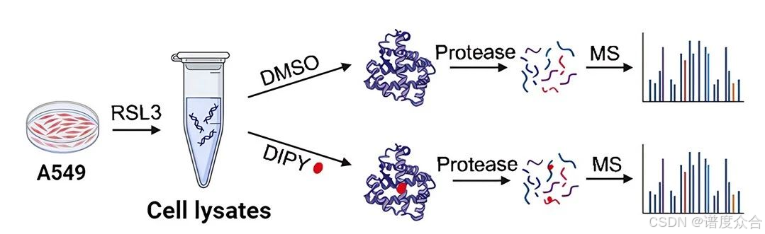 用RSL3(5 μM)预处理A549细胞(诱导铁死亡),收集裂解液分别与DIPY以及DMSO(二甲基亚砜)进行孵育,然后用蛋白酶K消化10分钟,而后进行质谱检测,筛选差异表达蛋白。经过Reactome通路富集分析,确定靶蛋白,并通过细胞热转移实验(CETSA)、药物亲和反应靶向稳定性(DARTS)、表面等离子共振(SPR)等实验进一步证明药物与靶蛋白的直接结合。最后使用基因敲除的A549细胞评估靶蛋白是否介导DIPY的抗铁死亡作用。