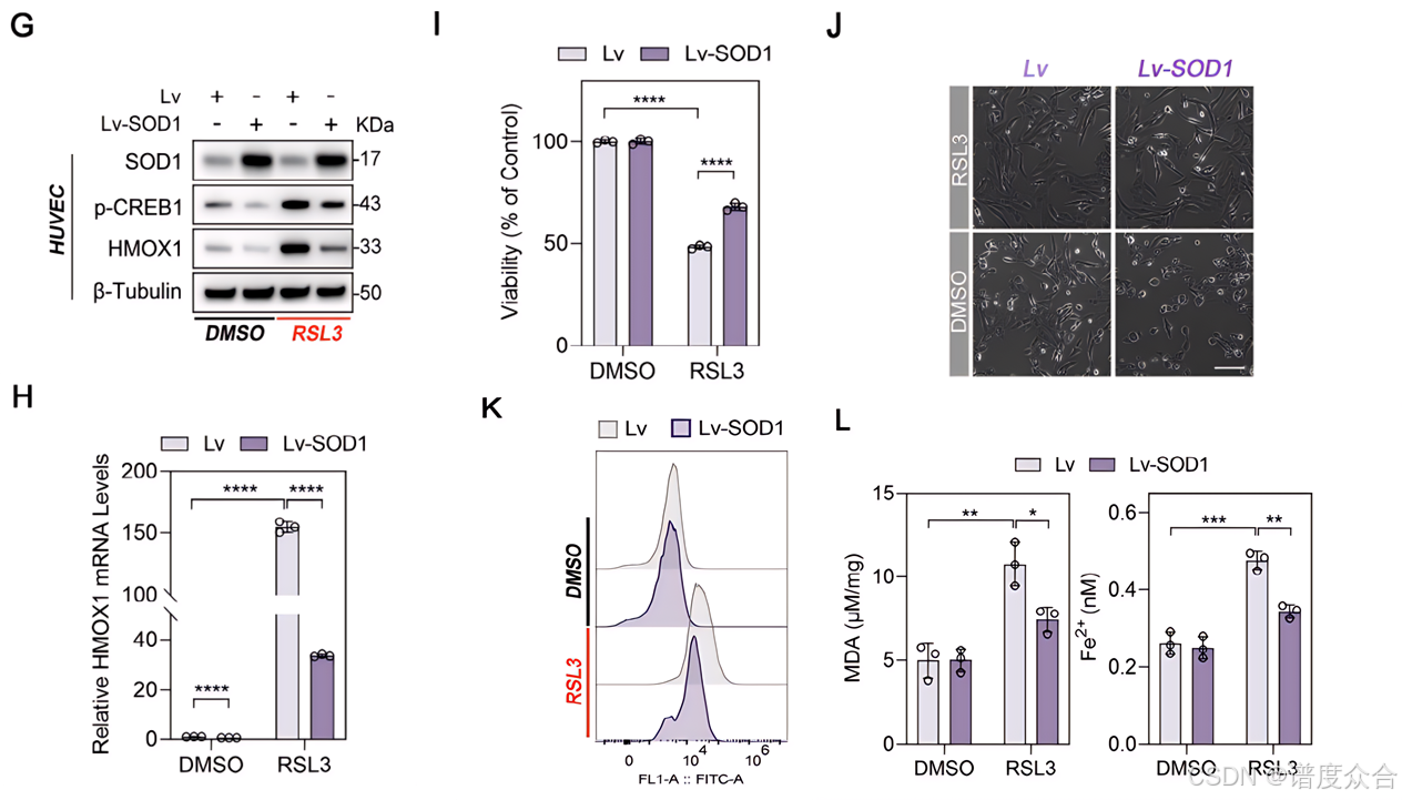 并且正如预期的那样,SOD1过表达减弱了RSL3诱导的CREB1磷酸化、HMOX1表达和铁死亡增加。