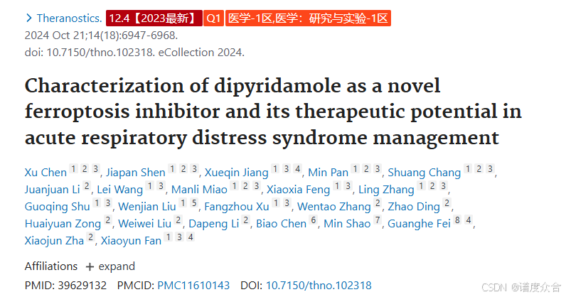 今天和大家分享一篇我们客户的文章,于2024年10月发表在《Theranostics》(IF=12.4)杂志上,标题为“Characterization of dipyridamole as a novel ferroptosis inhibitor and its therapeutic potential in acute respiratory distress syndrome management”。