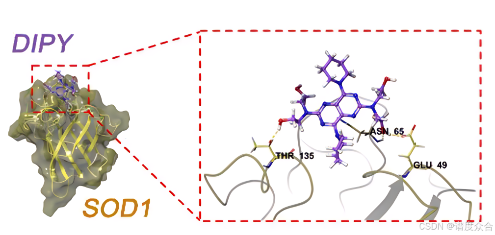 DIPY和SOD1分子对接的三维结合模式图显示,DIPY可能通过几个保守的氢键与SOD1结合。