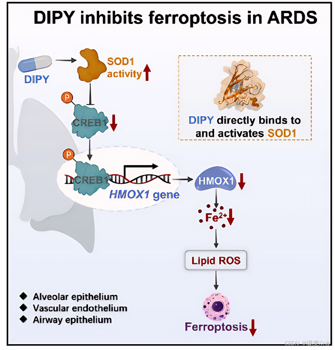 这项研究通过筛选FDA批准的药物库,确定双嘧达莫(DIPY)是肺上皮和内皮铁死亡的强效抑制剂,此外研究发现DIPY通过调节SOD1/CREB1/HMOX1通路抑制铁死亡,并进一步证实了DIPY在两种ARDS小鼠模型和人气道类器官 (hAOs)中的抗铁死亡和治疗作用。