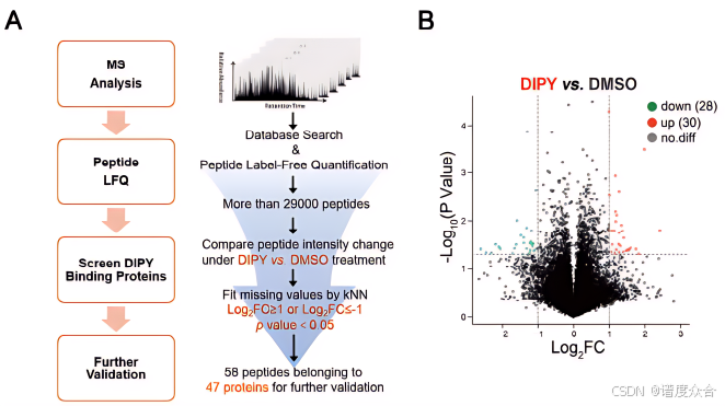 对DIPY以及DMSO对照处理后的细胞进行质谱检测分析,LiP-MS结果显示,共筛选出对应于47种蛋白质的58条肽段。