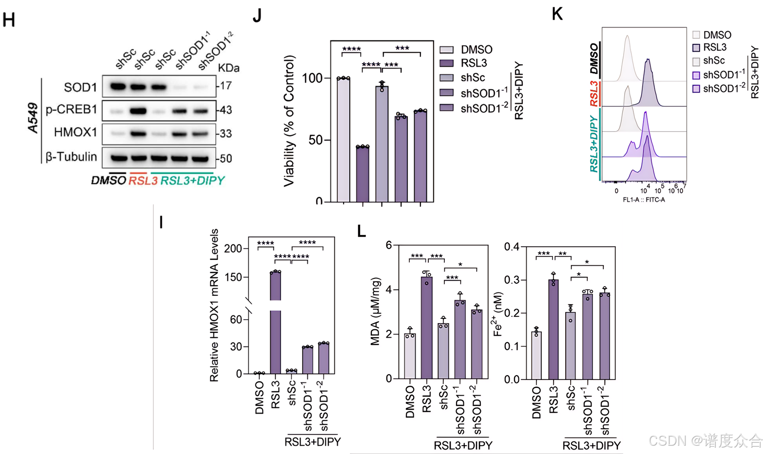 该研究为了评价SOD1介导DIPY的抗铁死亡作用,在A549细胞中使用shRNA敲低SOD1。结果显示,敲低SOD1导致CREB1磷酸化、HMOX1表达和铁死亡敏感性显著升高。