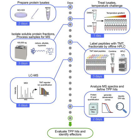 药物作用机制研究:TPP技术在抗炎药物和抗癌药物研究中展现了独特优势。例如,通过监测抗癌药物处理后相关蛋白的热稳定性变化,TPP能够揭示药物与靶点的直接相互作用,为新型抗癌药物的开发提供关键靶点信息。例如,研究通过TPP技术成功筛选出HnRNP A2/B1作为雷公藤内酯(Triptolide, TP)抗肿瘤作用的潜在直接靶点,不仅揭示了TP的多靶点协同机制,还为天然产物药物靶点的快速筛选提供了新的技术手段。