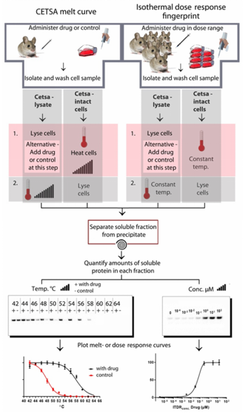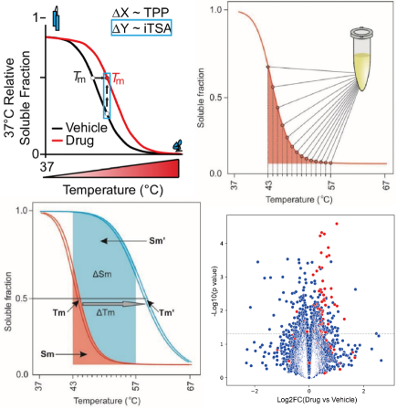 - 简化流程TPP-ITSA(等温位移分析):通过等温位移分析(Isothermal Shift Assay, ITSA)实验,比较药物处理组与对照组在单温度刺激下的蛋白变性水平差异(热稳定性变化),筛选潜在药物作用靶点。
