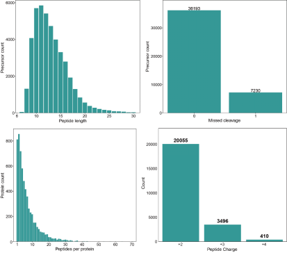 项目质控结果,包括肽段长度分布、漏切位点分布、蛋白肽段数目分布,肽段电荷分布。